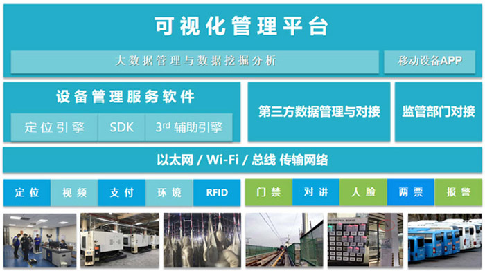 工厂定位系统是由定位设备、传输网络、服务软件、应用平台构成。 其中定位设备通过超宽带UWB、蓝牙信号,实现对目标的覆盖。 传输网络将定位数据传输到服务层,并保证通讯的实时性、可靠性。 服务层包括定位引擎、设备管理平台、对外数据融合接口等。 应用层则将定位数据进行整理,结合工厂逻辑,进行业务驱动、挖掘、展示。
